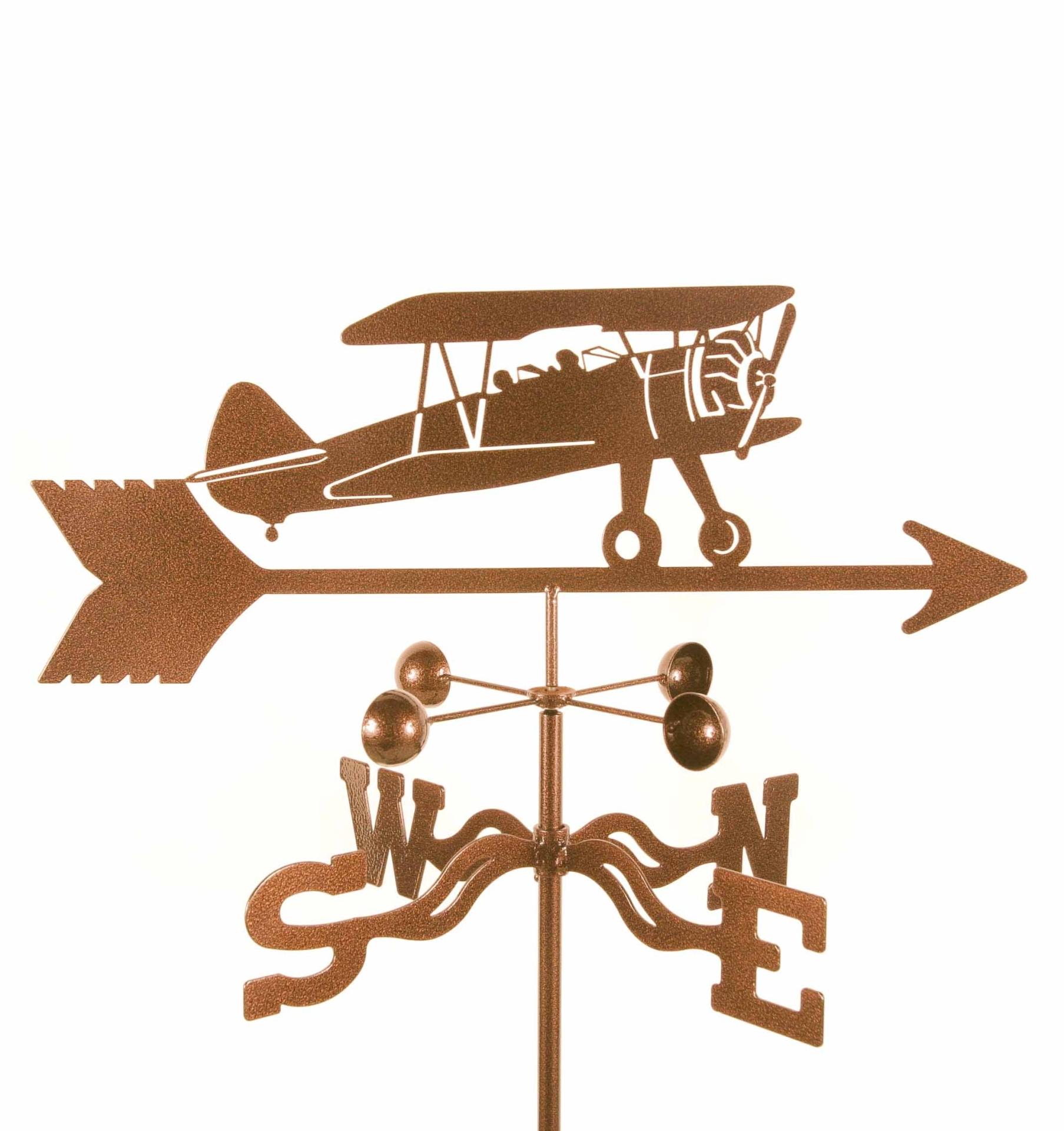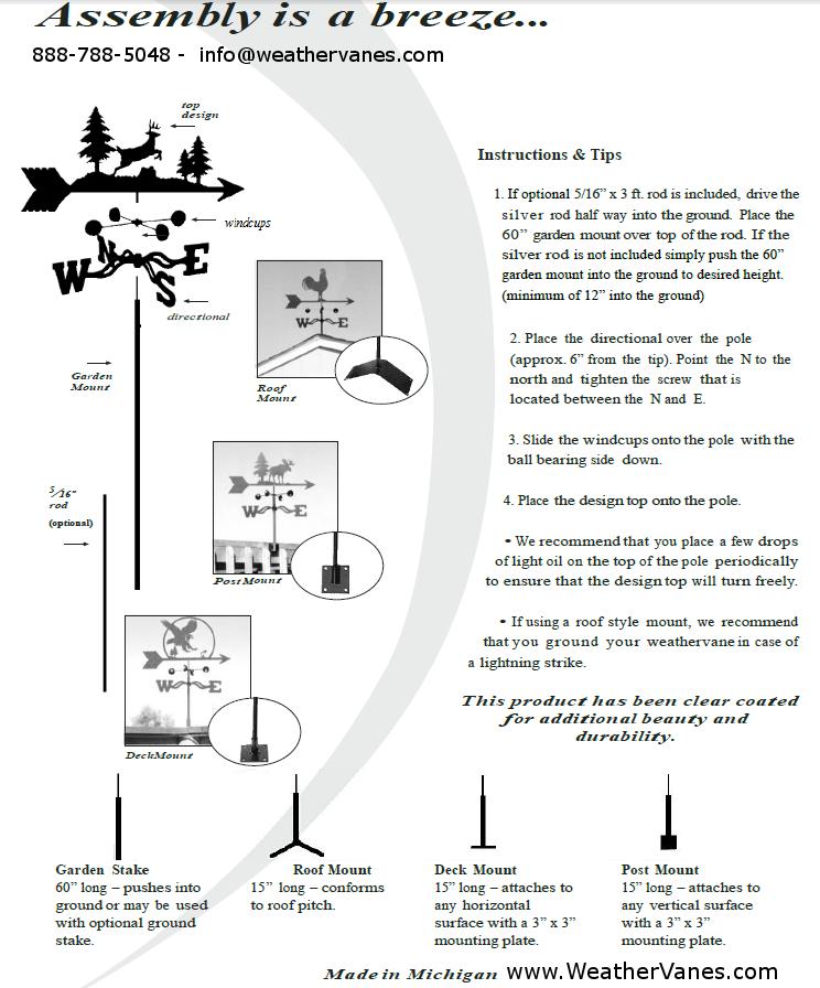 Steel weather vane is handcrafted using 14 gauge solid steel with a beautiful, durable and scratch resistant copper vein powder coat and clear coat finish baked on. Textured finish give the appearance of the old time hammered copper look. Made in USA. Available with roof mount, Post mount, Deck mount or 5 foot garden stake. Comes complete as shown. Sealed ball bearings in windcups. One year warranty on the finish.
