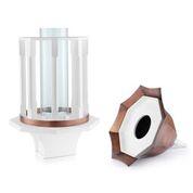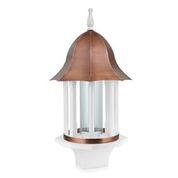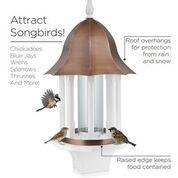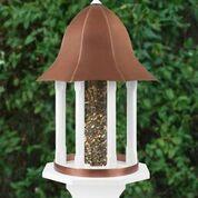 The Manor Bird Feeder is the perfect focal point in any yard. Classic columns enclose a clear tube creating a piece that exemplifies perfection. The beautiful bell-shaped, pure copper roof is removable, so that filling is seamless. A large feeding platform provides shelter and protection from precipitation. Watch bright birds feed on seed, as their vibrant colors complement white-painted long-lasting mango hardwood. Since a post is all it needs, installation is done with ease. Drainage holes in tray help keep seed dry. Measuring 33″ H x 18″ W x 18″ D, it’s sized to hold a plentiful 8-pound seed capacity so you don’t have to fill as often!