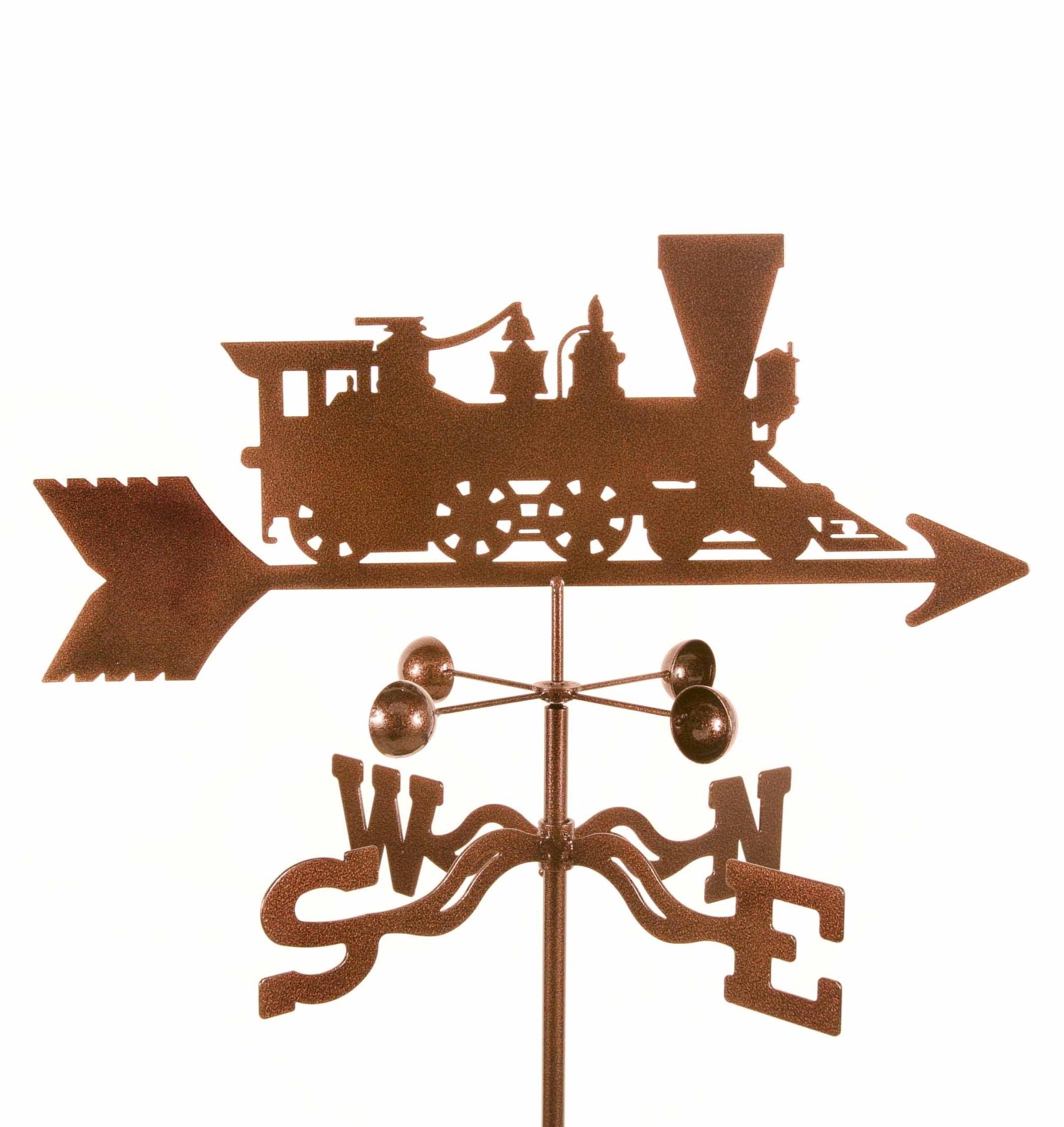 Steel weather vane is handcrafted using 14 gauge solid steel with a beautiful, durable and scratch resistant copper vein powder coat and clear coat finish baked on. Textured finish give the appearance of the old time hammered copper look. Made in USA. Available with roof mount, Post mount, Deck mount or 5 foot garden stake. Comes complete as shown. Sealed ball bearings in windcups. One year warranty on the finish.